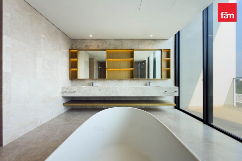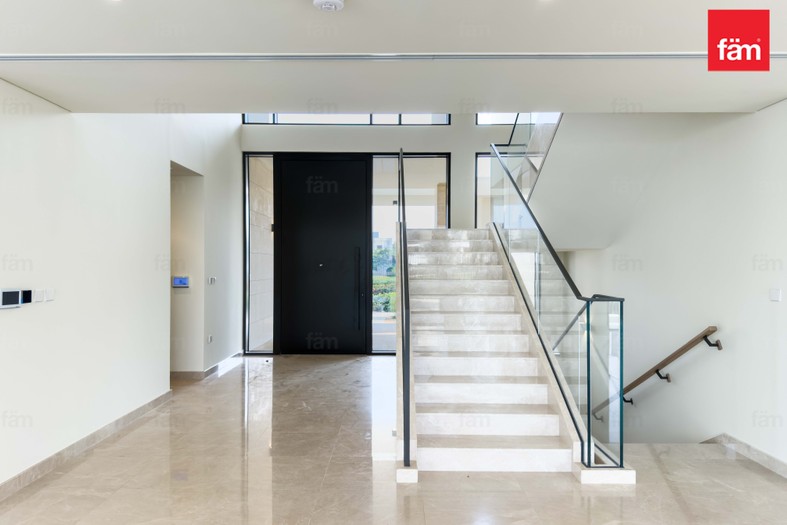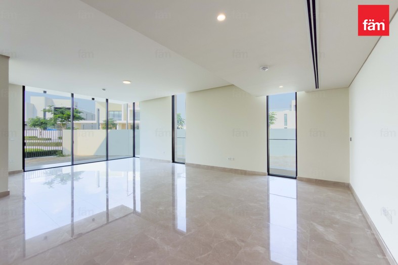 The villa features five spacious bedrooms, six bathrooms, a maid’s room, walk-in closets, and built-in wardrobes throughout. Floor-to-ceiling windows showcase open park and water views, filling the home with natural light and creating a calm, resort-style atmosphere.