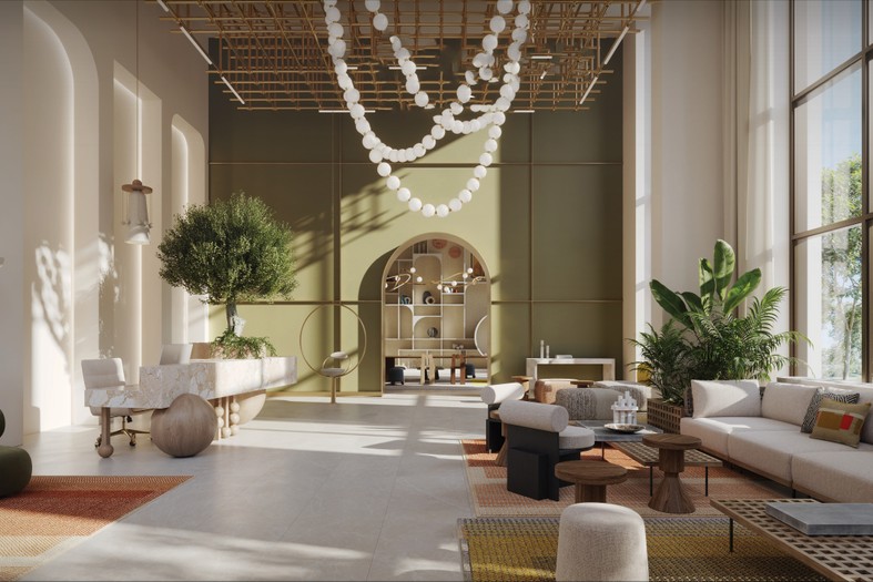 Floor-to-ceiling windows provide abundant natural light and frame stunning views of green spaces and the Dubai skyline.